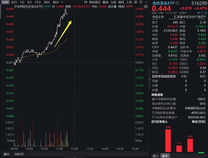 7月8日,光伏板块异军突起美林资管,呈现底部反转态势!光伏龙头ETF(516290)放量飙涨,截至11:18大涨超4%,成交额爆量,已超昨日全天!